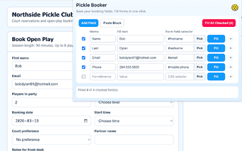 Pickle Booker, Chrome tarayıcısı için geliştirilmiş bir eklenti olup, kullanıcıların tekrar eden rezervasyon formlarını hızlı ve etkin bir şekilde doldurmalarına olanak tanır. Bu eklenti, kullanıcıların form alanlarını özelleştirmesine imkan sağlar; referans adı, CSS seçici ve değer ekleyerek kendi alanlarını oluşturabilirler. Tek bir alanı doldurmak için 'Fill' seçeneğini, birden fazla alanı doldurmak için ise 'Fill All Checked' seçeneğini kullanabilirler. Kullanıcılar ayrıca toplu veri yapıştırma işlemi gerçekleştirerek hızlıca alanlar ekleyebilirler. Herhangi bir formu otomatik olarak göndermeden önce tüm verileri gözden geçirme imkanı sunar.